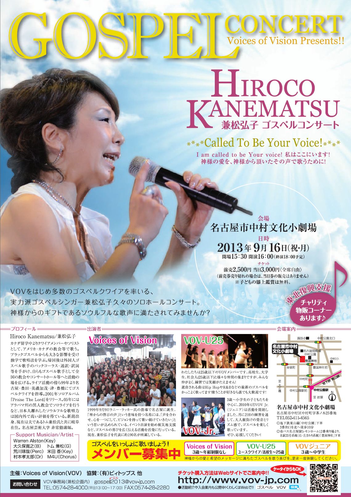 <コンサート概要> ●日時:2013年9月16日(月祝)開場15:30、開演16:00(終演18:00予定) ●会場: 名古屋市中村文化小劇場 名古屋市中村区中村町字茶ノ木25番地 中村公園文化プラザ3F [中村図書館に併設] ●アクセス:公共交通機関をご利用ください。 地下鉄東山線「中村公園」下車 3番出口より北へ徒歩10分 市バス「豊国神社」下車すぐ(名駅25号系統(右・左まわり系統)、中村巡回系統) ●主催:Voices of Vision(VOV) ●協賛:(有)ビィトップス 、他 ●出演:兼松弘子、Voices of Vision、VOV-U25、VOV Jr. ●Support Musician/Artist:Warren Alston(Key)、大久保憲之(B)、トム兼松(G)、荒川琢哉(Perc)、米田香(Key)、村本孝太郎(Dr)、M4U(Chorus) ●料金:前売り2500円、当日3000円【全席自由】 座席数は約300。数に限りがあります。ご購入はお早めに! ●TOPICS:東北支援のチャリティグッズ販売コーナー設置します! |