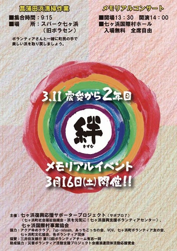 VOVの動き ◆10:00〜菖蒲田浜海岸清掃ボランティア参加 ◆13:30〜16:00 追悼コンサート ・13:30/カフェ ・14:00〜14:30/挨拶・インフォメーション・ボランティア活動DVD上映 ・14:30〜15:30/追悼コンサート&ありがとうの手紙朗読/14:46に黙とう ・15:30〜16:00/VOVコンサート ※NaNa5931共演 ※詳細は、七ヶ浜復興応援サポータープロジェクトブログへ こちらをクリック |